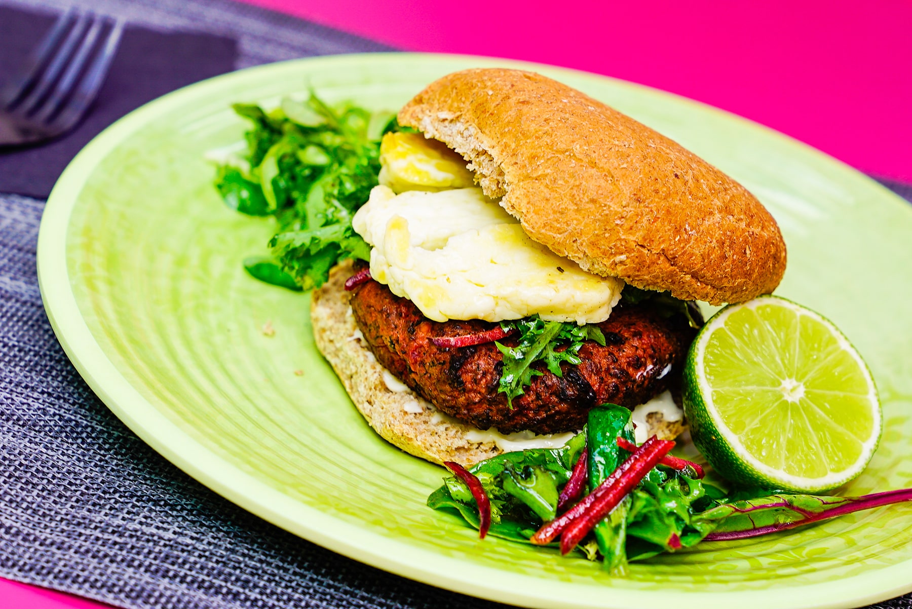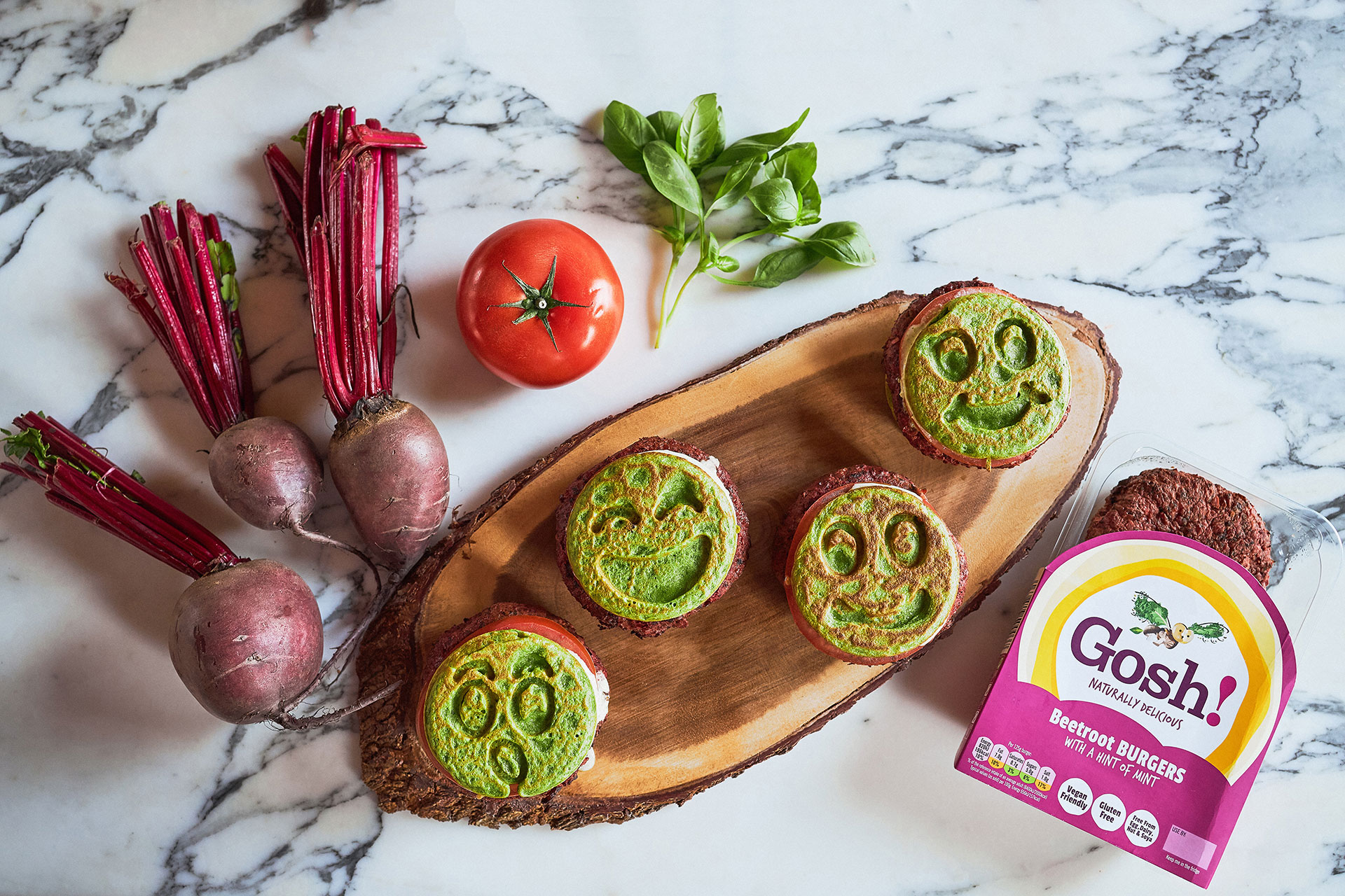 The raw beetroot has a sweet earthy flavour that goes perfectly with the citrusy tang of lemon juice. The earthiness of the beetroot flavour is enhanced by the leafy kale that gives a strong flavour as well as adding an element of crunch to the burger. Just a hint of mint brings a cooling sweetness that cuts through the overall earthiness of the product.