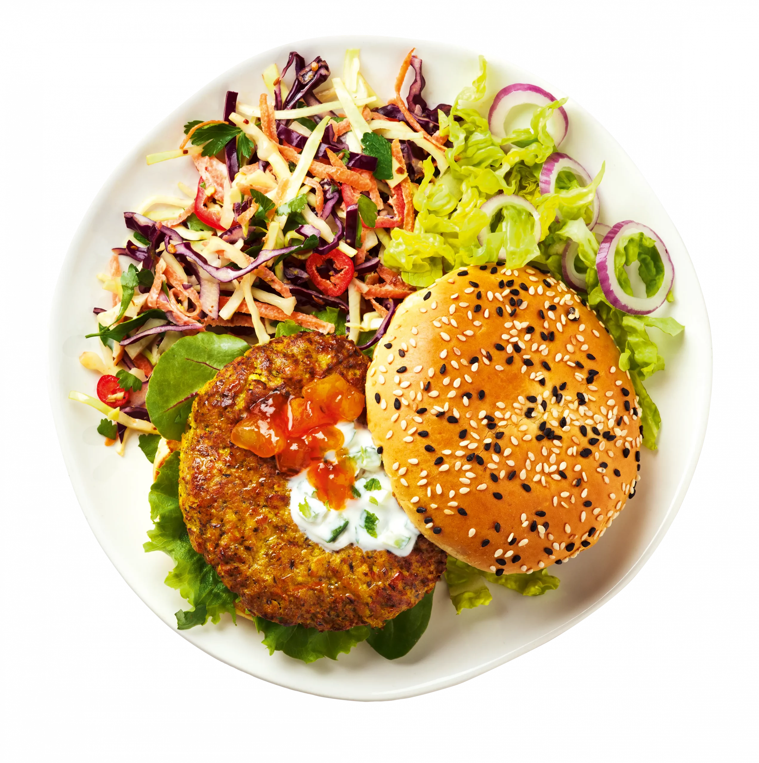 Cauliflower provides the perfect succulent, creamy base for these lip-smackingly good plant-based burgers. Earthy chickpeas, sweet potato and fiery cayenne pepper join the mix to complete the base, and a beautiful blend of Indian herbs and spices give a hearty kick. Lastly, sweet, smooth coconut and a dash of lemon are added to balance out this Bombay spice sensation.