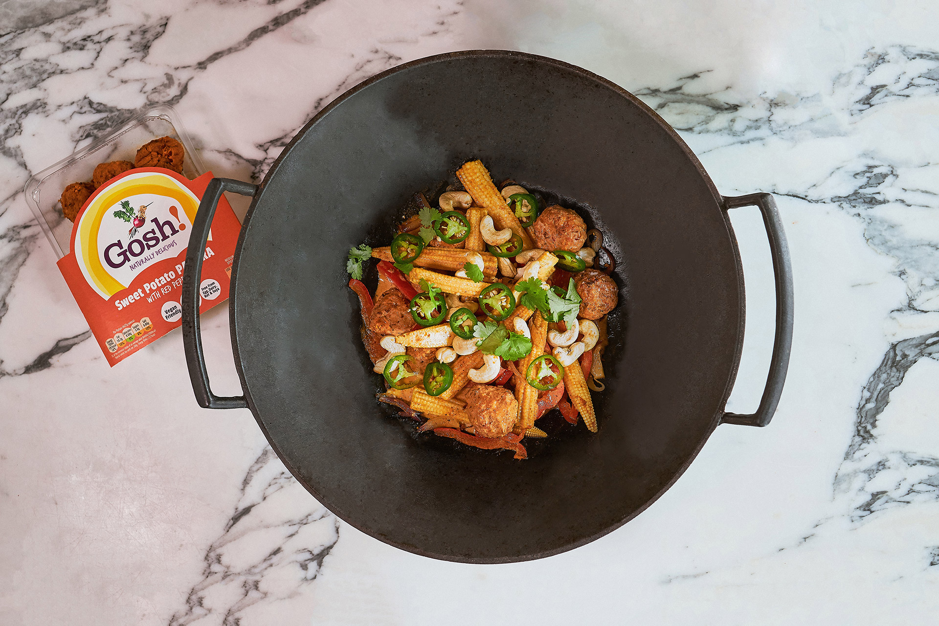 Sweet Potato (29%), Chickpeas (29%), Red Pepper (14%), Rapeseed Oil, Potato Flake, Tomato Puree, Onion, Garlic Puree (Water, Garlic Granules), Ground Coriander, Ground Cumin, Lemon Juice from Concentrate (Concentrated Lemon Juice, Water), Paprika, Salt, Chilli Flakes.