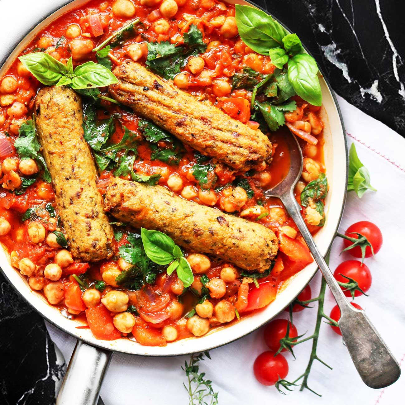 Chickpeas are the base ingredient to our special sausages; these legumes are a great source of protein, fibre, iron, and B vitamins. When chickpeas are mixed with butter beans, they create an amazing creamy base with a subtle nutty and savoury flavour that combines fabulously with the savoury notes of our spice blend.
