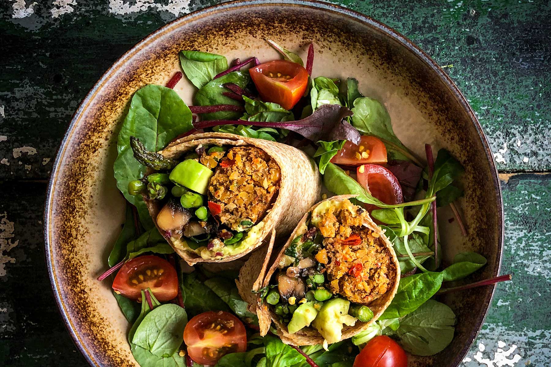 4. Now assemble to Burrito wraps by spreading the lime guacamole on first then the spinach leaves and chopped tomatoes. Then the cut the koftas in half and add along with the tofu and mushroom mixture. If you like it spicy add some chopped fresh chillies here and then wrap up. Place the 4 wrapped burritos back in the oven for 5 minutes on a baking tray and serve with a wedge of fresh lime.